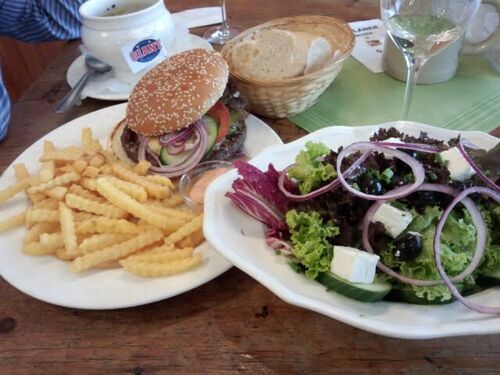 苦労しています、言葉の壁、ドイツ語。 話せない!読めない! 何とか、チーズ、ベーコン、牛肉そしてベークドをメニューから探して注文したら なんとハンバーガーでした。(^_^;)